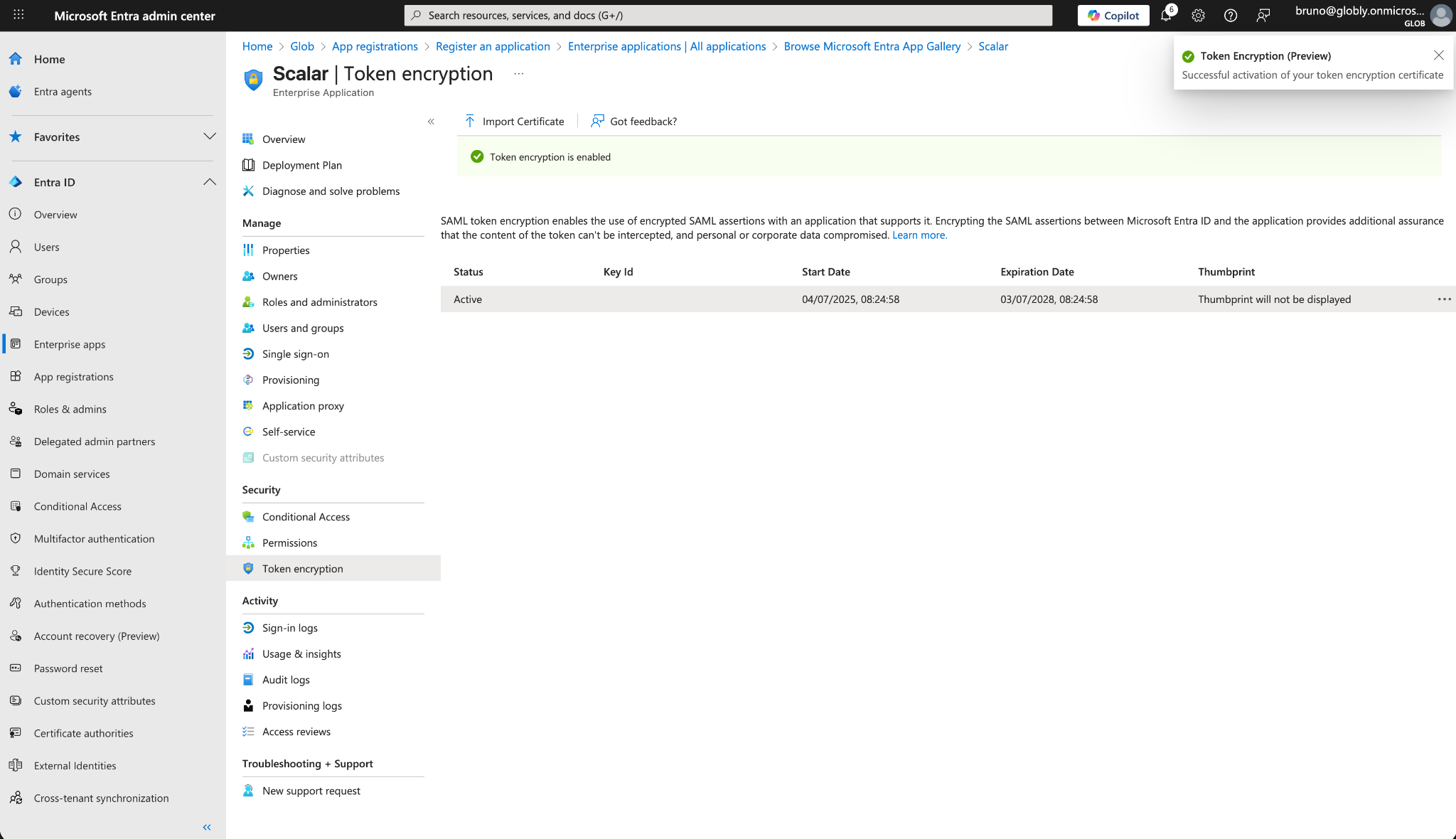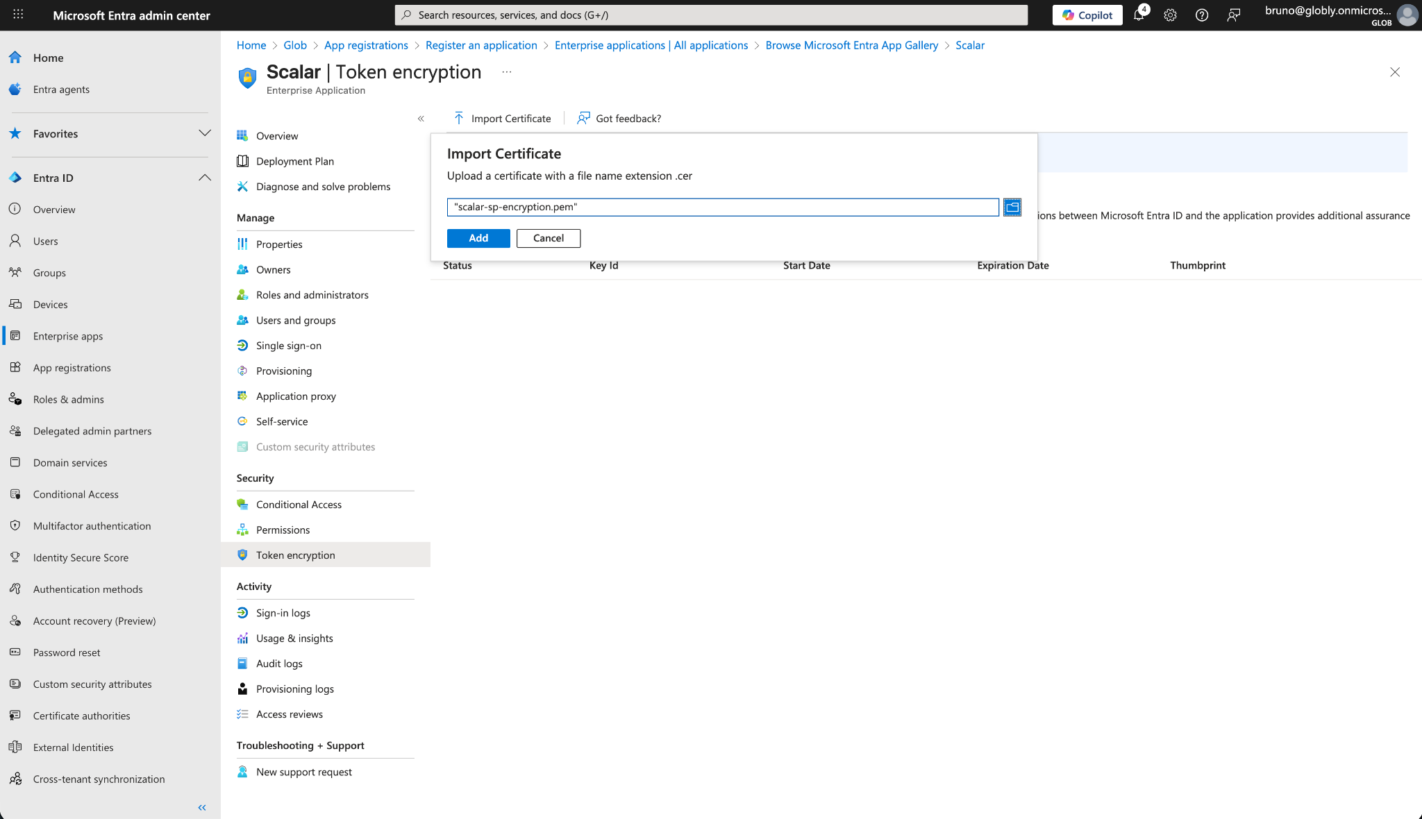 Scalar requires token encryption for SAML assertions. Download the encryption certificate from the Scalar and import it into Microsoft Entra ID under Token encryption: